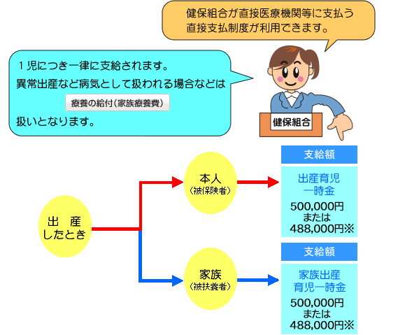 | ※ | 産科医療補償制度に加入する医療機関等で出産した場合は500,000円、加入していない医療機関等で出産した場合は488,000円(2023年3月までは420,000円または408,000円)となります。 (産科医療補償制度については公益財団法人 日本医療機能評価機構「産科医療補償制度」のホームページをご覧ください) |