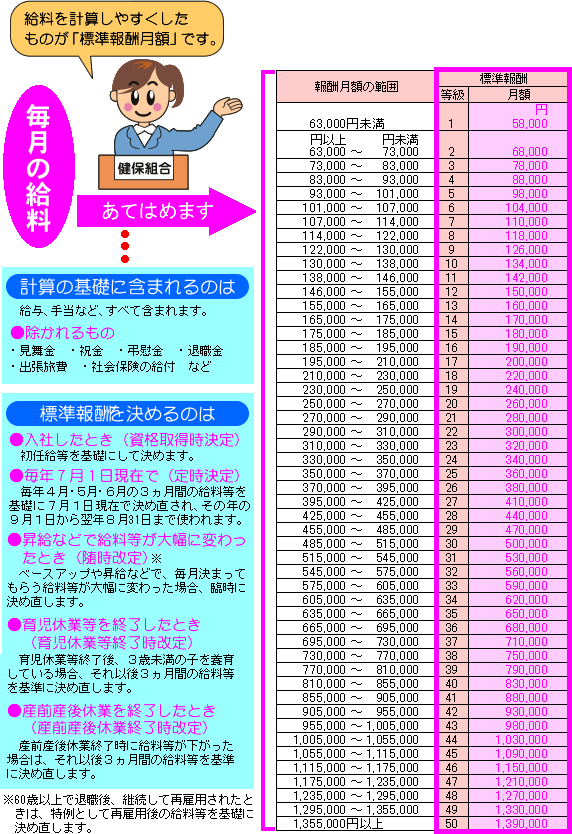 給料は月によって変わりますから、給料そのままを保険料計算の基礎にするのでは大変やっかいな仕事になります。そこで、計算しやすい単位で区分した仮の報酬を決め、各人が実際に受ける給料をこれにあてはめて保険料の計算をしています。この仮の報酬を「標準報酬月額」といい、現在、最低58,000円から最高1,390,000円までの50等級に分けられています。